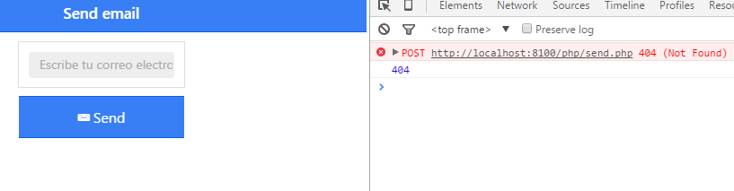 send.php is obviously not available on http://localhost:8100/send.php - thatâs what the Error message 404 - Not Found is telling you.