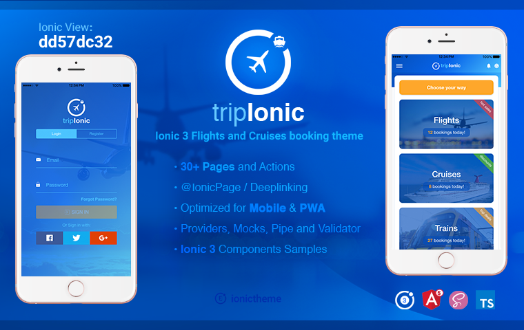 tripIonic, Ionic 3 flights cruises trains booking theme, truly focused in trip tickets/flow, seek and buy flight, cruise and train ticket; with booking list history and local weather API sample and more pages.