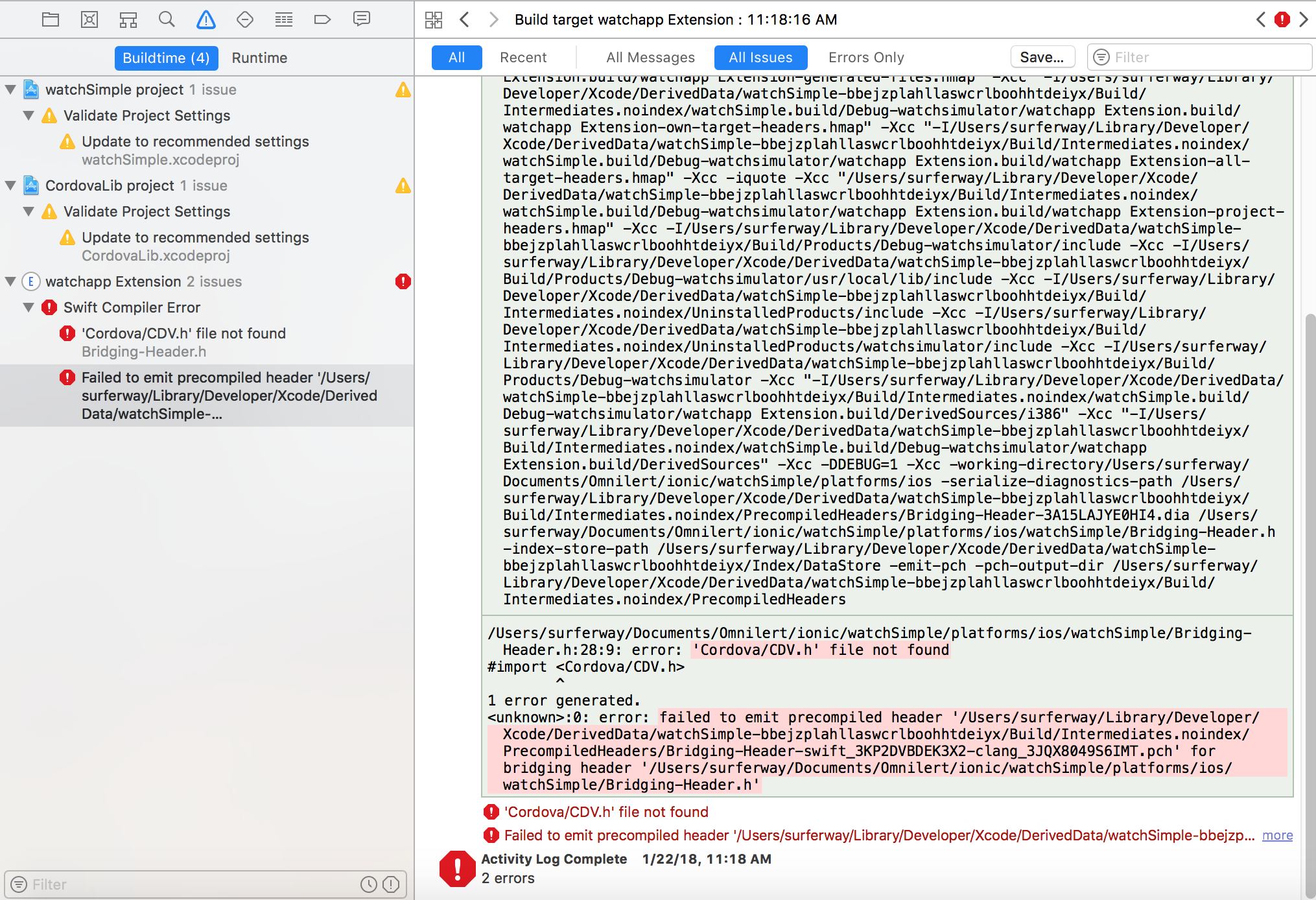 Error: Error code 65 for command: xcodebuild with args: -xcconfig,/Users/surferway/documents/omnilert/ionic/watchSimple/platforms/ios/cordova/build-debug.xcconfig,-workspace,watchSimple.xcworkspace,-scheme,watchSimple,-configuration,Debug,-sdk,iphonesimulator,-destination,platform=iOS Simulator,name=iPhone X,build,CONFIGURATION_BUILD_DIR=/Users/surferway/documents/omnilert/ionic/watchSimple/platforms/ios/build/emulator,SHARED_PRECOMPS_DIR=/Users/surferway/documents/omnilert/ionic/watchSimple/platforms/ios/build/sharedpch